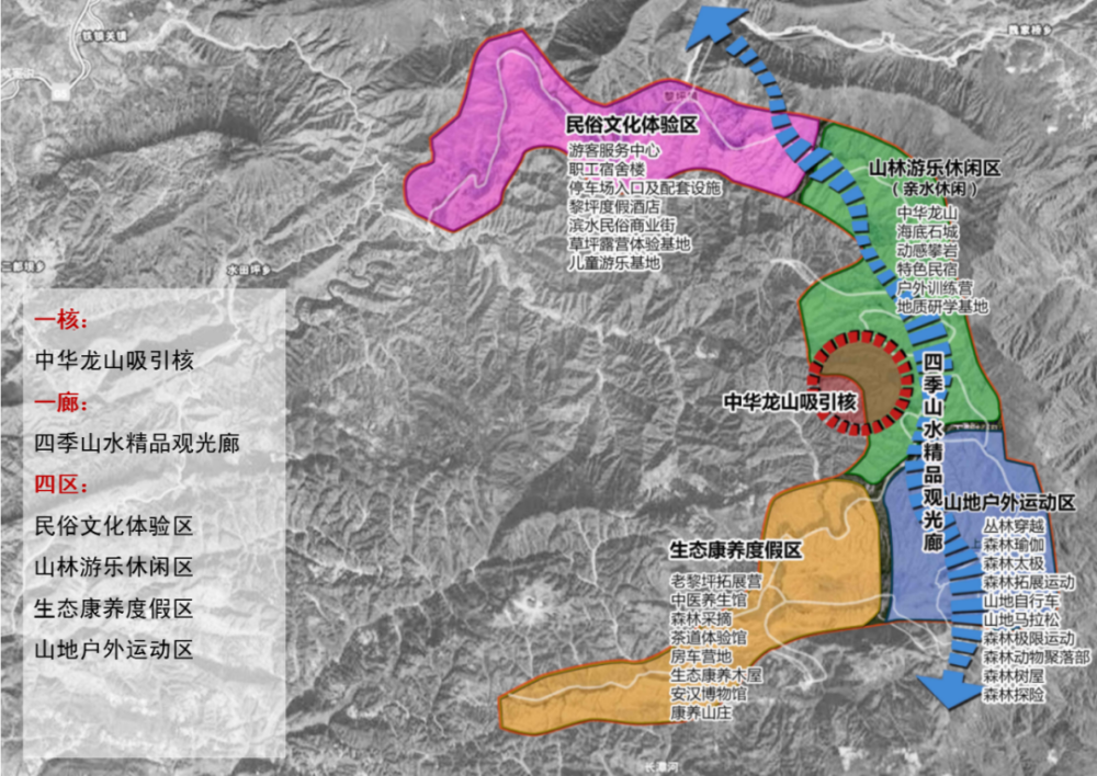 中红旅针对黎坪景区创建省级康养旅游度假区需求,规划汉中市黎坪康养旅游度假区总面积62平方千米,定位“陕西天府之国·康养休闲胜地”,根据项目地基底条件和资源分布特点,规划打造“一核、一廊、四区”的空间布局,通过生态美景营造、康养休闲度假、创新休闲娱乐、夜游体系构建等方式,打造本项目成为集休闲运动、文化创意、科普研学、亲子娱乐、原乡体验、康养度假等功能于一体的汉中生态文化旅游休闲度假区。