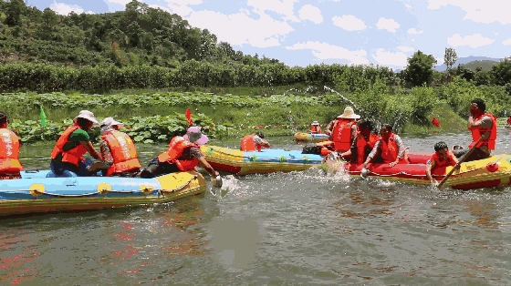 有竹筏和皮划艇漂流可供选择,前半段河水比较湍急,后面会出现一个平静的湖面,可以欣赏怡人的山水风光或者打水仗。