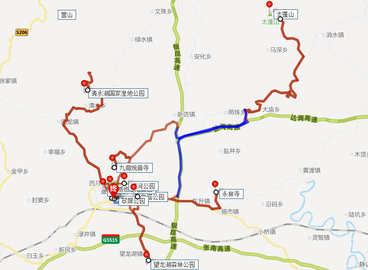 2、营山县十大景点自驾游行程路线:营山县-翠屏公园(大南街)-白塔公园-营山县滨河公园-望龙湖森林公园-营山县永林寺-太蓬山-九曲观音寺-朗池湿地公园-西月湖公园-清水湖国家湿地公园-营山县。