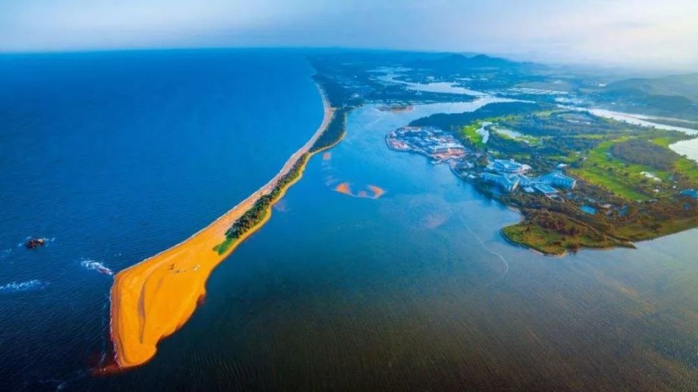 玉带滩位于海南万泉河出海口,它的外侧是一望无际的南海,内侧则是万泉河,两者之间如同打太极,河水不犯海水,阴阳和谐相处。坐在玉带滩上,欣赏着这一美景,不免感叹一切都是那么美好。