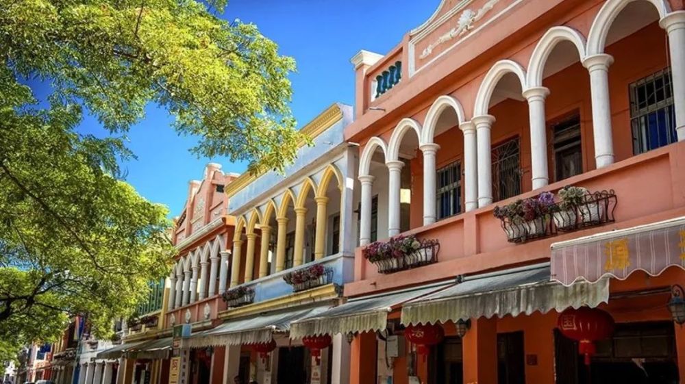 骑楼与藤萝雨树在小镇的街道上相映成趣,色彩斑斓的南洋风光,被藤萝雨树蜿蜒的树枝,所掩罩的热闹的街道,行人与车辆熙熙攘攘,道路两旁延伸着精美别致的骑楼,阳台上花开艳丽的缤纷,如同穿越到了上个世纪。