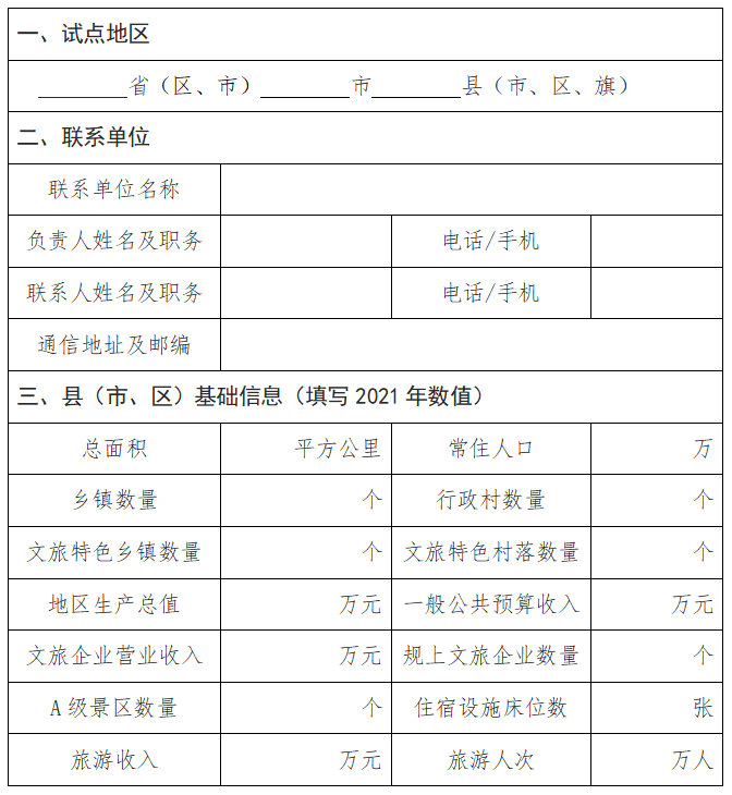 (一)试点申报主体为县级(包括县、县级市、市辖区等县级行政区划单位)人民政府。申报主体制定试点实施方案(见附件3),填报基本情况表(见附件2),将材料报至省级文化和旅游部门。