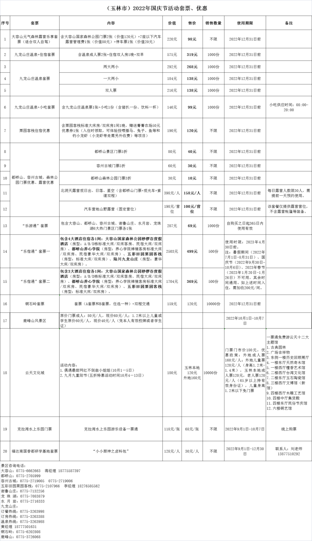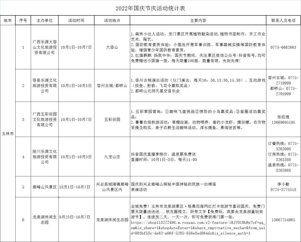 国庆黄金周即将到来,为丰富群众的精神文化生活,玉林各级文旅部门,景区景点等将策划组织丰富多彩的文化旅游节庆活动,推出多项惠民措施,市民游客可以走进全市各地景区景点,体验五彩玉林田园都市给您带来的欢乐。