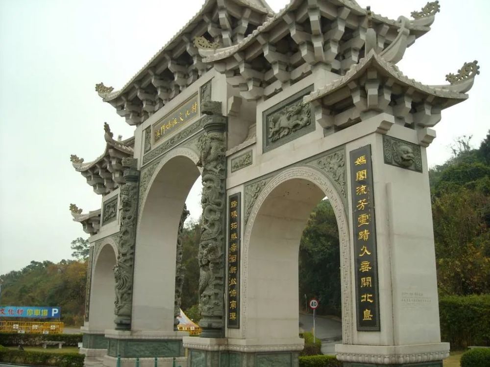 山下入口有座石牌坊,三拱洞开呈墨青色,威严不失秀丽。一条长长的石阶通往天后宫,石阶之间有一幅幅青石浮雕,麒麟、凤凰、狮鹤、龙虎等瑞兽呈现其上,雕工细致。
