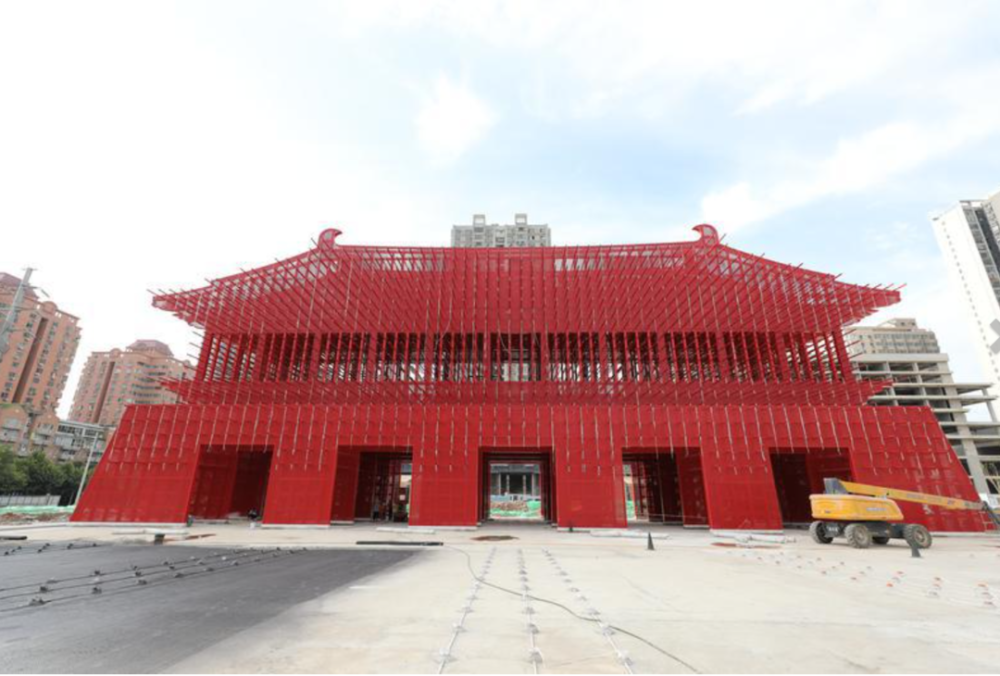 7月5日,唐明德门城墙遗址公园建设正在进行中,红色1:1钢结构模型主体已基本成型。据悉,明德门是隋大兴城和唐长安城正南城门,位于启夏门和安化门之间,是外郭城中唯一有五个门道的城门。(文/图 记者 王旭东)