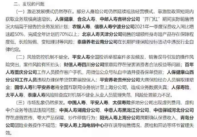 5日,银保监会发布关于《关于加强规范管理促进人身保险公司年度业务平稳发展的通知》落实情况的通报,通报指出,人身保险公司激进发展模式仍然存在,部分人身险公司仍然延续粗放经营模式,靠激励政策短期内获取业务规模高速增长;风险防控机制不健全;市场乱象仍然多发。三项问题共涉及中国人寿、平安人寿、太平人寿、泰康人寿、人保健康等20余家人身保险公司。