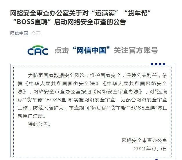 5日,网信中国发布公告:为防范国家数据安全风险,维护国家安全,保障公共利益,依据《中华人民共和国国家安全法》《中华人民共和国网络安全法》,网络安全审查办公室按照《网络安全审查办法》,对“运满满”“货车帮”“BOSS直聘”实施网络安全审查。为配合网络安全审查工作,防范风险扩大,审查期间“运满满”“货车帮”“BOSS直聘”停止新用户注册。
