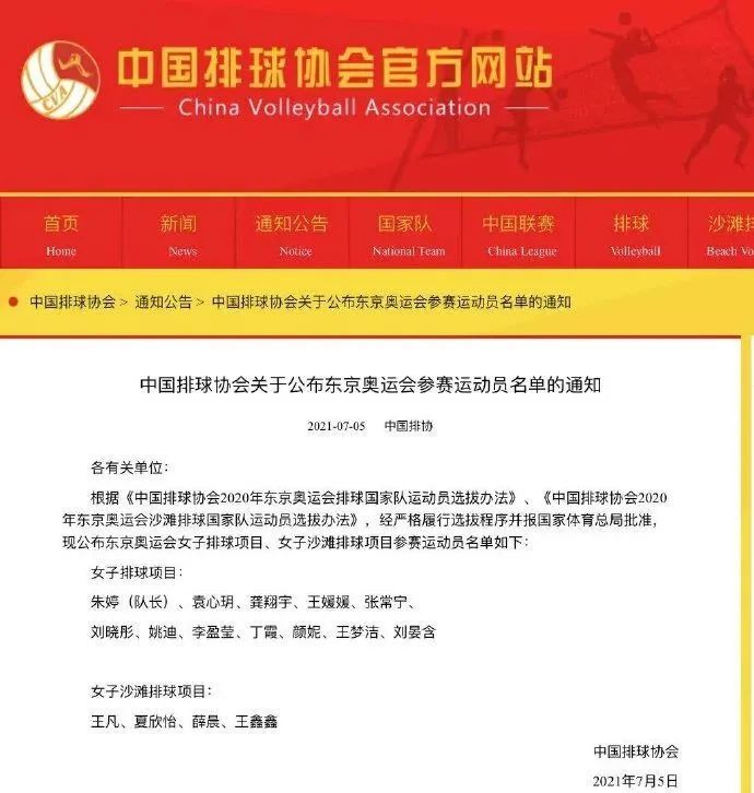 7月5日下午,中国排协网站公布中国女排东京奥运12人参赛名单。朱婷担任球队队长,张常宁、李盈莹和刘晓彤为球队主攻,颜妮、袁心玥和王媛媛组成副攻,龚翔宇、刘晏含担任接应,二传为丁霞和姚笛,自由人由王梦洁担纲。