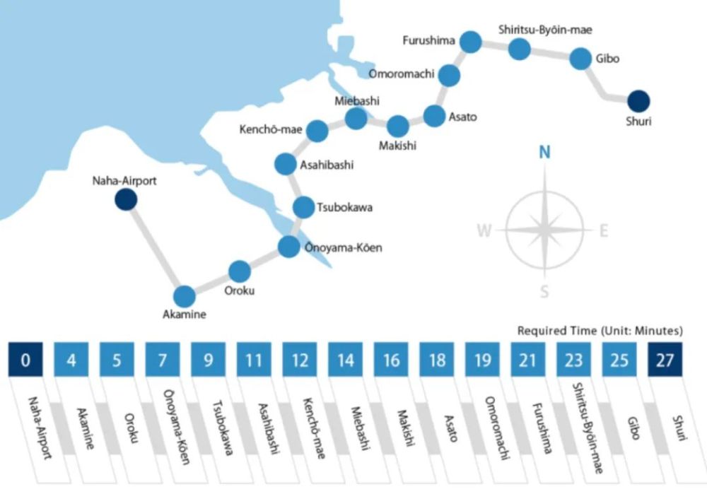 单轨电车行驶区域仅限那霸市区,连接那霸机场与首里城。主要途径的旭桥站(那霸巴士总站)、县厅前站、美荣桥站和牧志站串起国际通商业街,都是酒店住宿较为集中的区域。