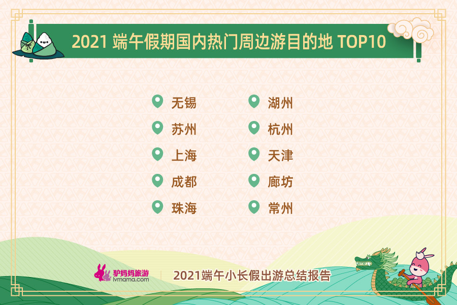 中新经纬客户端6月14日电 14日,驴妈妈旅游网发布《2021端午小长假出游总结报告》。报告显示,中短途周边游是今年端午假期旅游市场的主角,近六成游客选择“3小时圈”目的地,无锡、苏州、上海、成都、珠海、湖州、杭州、天津、廊坊、常州最为热门。北京欢乐谷、上海迪士尼乐园、常州恐龙园、成都大熊猫繁育研究基地等成为端午全国十大最热门景区。