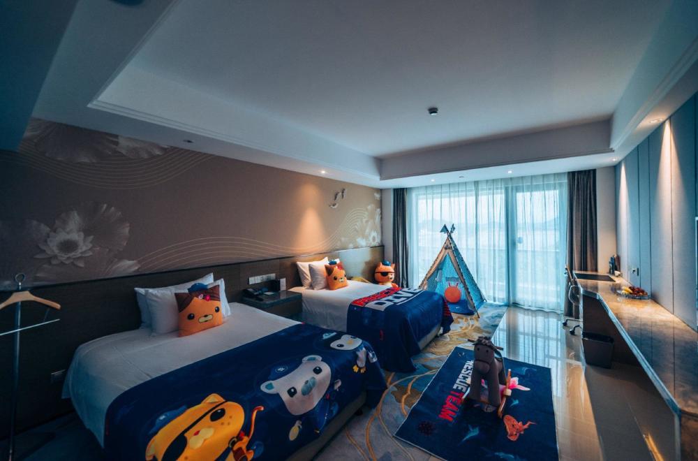 酒店内装修风格(包括餐具)用了迷人的“天湖蓝”,与窗外的大环境相得益彰。预订的亲子房里还有一顶小帐篷和木马,小朋友从一进门就开始玩起了过家家。