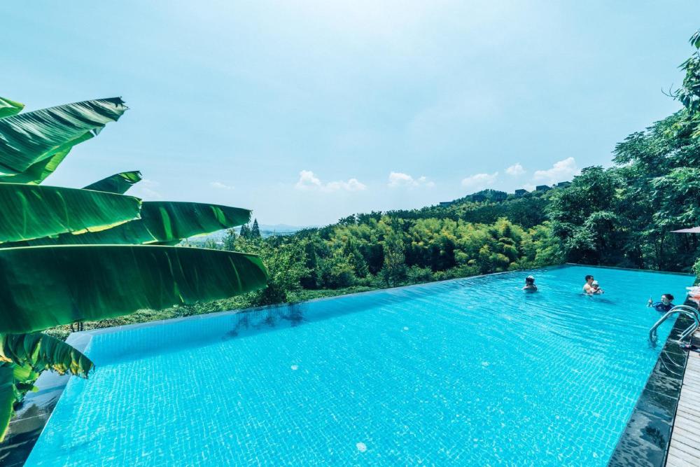 半坡上的游泳池是美岕山野温泉度假村的画龙点睛之作,通透的玻璃围栏,加上无敌开放感,人浮在水面,可以畅享遨游在半空中。