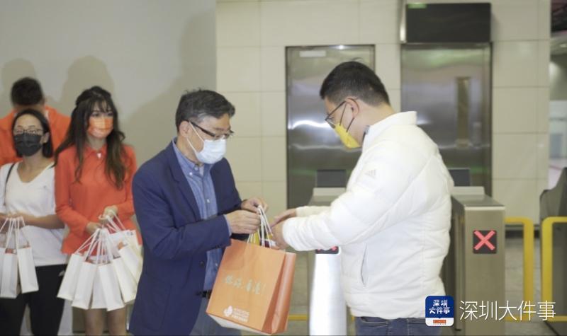 “香港欢迎你!”1月15日,广深港高铁香港段恢复通车首日,港铁工作人员为第一批抵港旅客准备了礼包。首批旅客过闸后收到了由港铁、旅发局分别准备的“橙色礼包”,香港运输及物流局局长林世雄第一时间给卜先生送上礼包,并询问了乘坐体验。