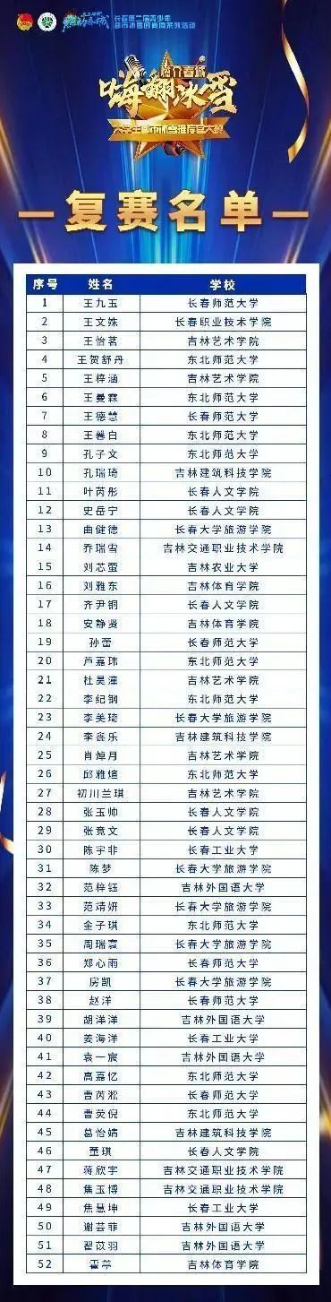 “燃介春城·嗨翻冰雪”之大学生都市冰雪推荐官大赛自开赛以来得到了来自东北师范大学、吉林艺术学院、长春大学旅游学院、吉林外国语大学、长春市电子科技学院、吉林工程技术师范学院、长春人文学院、长春东方职业学院、长春职业技术学院、吉林体育学院、吉林农业大学、长春师范大学、长春工程学院、长春工业大学、吉林交通职业技术学院、吉林建筑科技学院等17所高校的积极响应,285名长春青年大学生踊跃报名参赛并在线上激烈角逐,最后经过大赛组委会精心遴选,严格审核,共评选出52名选手成功入围复赛。