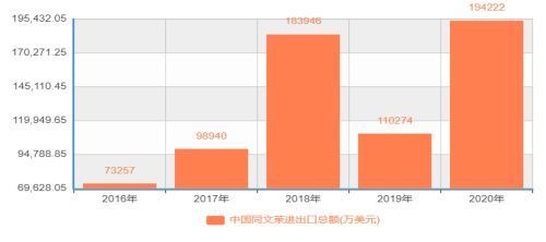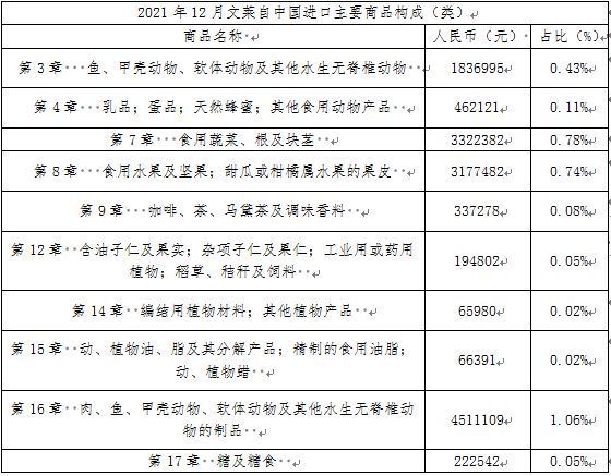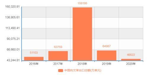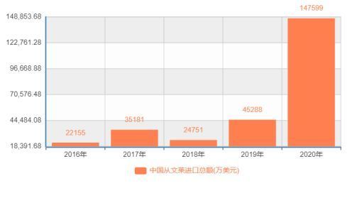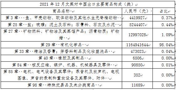 2021年1-6月,中文贸易额13.0亿美元,同比增长42.0%。其中,中国对文出口3.1亿美元,同比增长29.0%;自文进口9.9亿美元,同比增长46.5%。