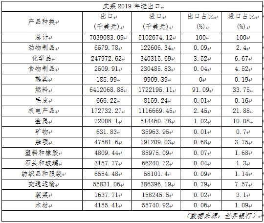 由世界银行2019年文莱贸易年度数据[ 世界银行|世界综合贸易解决方案系统|2019年柬埔寨国家概况]可以看出,文莱货物出口比重中燃料出口占的比例最高,为91.09%。商务部《对外投资国别(地区)指南》文莱部分指出,文莱主要出口商品是原油和天然气,2019年,原油和液化天然气共占出口总额的85.2%。其中原油出口额同比增长6.81%,液化天然气出口额同比下降2.24%。文莱经济结构单一,大米和新鲜牛奶的自给率非常低,90%左右的食品仍需进口,50%的渔产品消费依赖进口;工业基础薄弱,工业设备、农产品、日用品均依赖进口。文莱进口贸易中,主要进口商品为矿物燃料、机械及交通设备、工业制成品、食品,上述几项产品进口额占当年进口总额的85.8%。