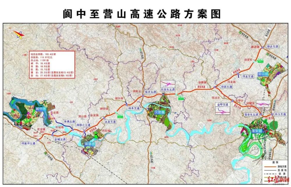 阆中至营山高速公路,线路全长105公里,建设工期3年。项目起于南充阆中市西南,与兰海高速G75南充至广元段相接,经南充市南部县、仪陇县、蓬安县、营山县,顺接营达高速(S26)及张南高速(G5515)南充经大竹至重庆梁平段。