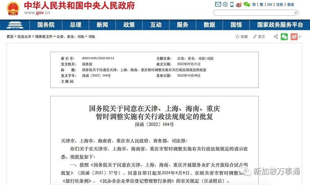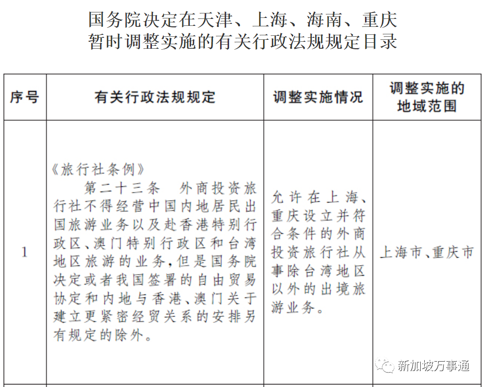10月8日,中国发布了《国务院关于同意在天津、上海、海南、重庆暂时调整实施有关行政法规规定的批复》。该发文表示,允许在上海、重庆设立并符合条件的外商投资旅行社从事除台湾地区以外的出境旅游业务。时间为从即日起到2024年4月8日。