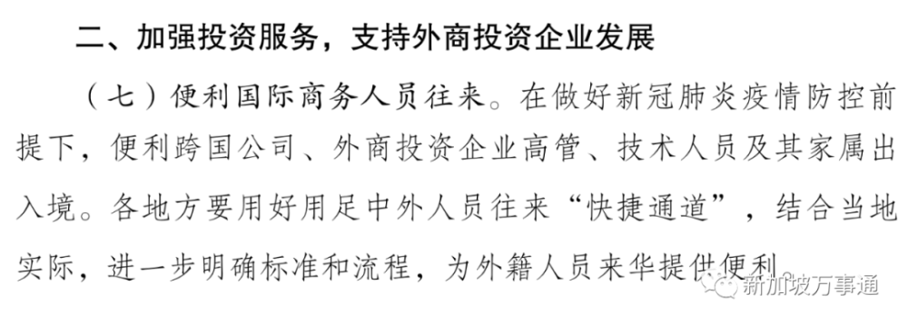 除了相关的招商引资政策,让更多外籍投资商来华投资,该政策第二部分第七条还表示,要便利国际商务人员往来。
