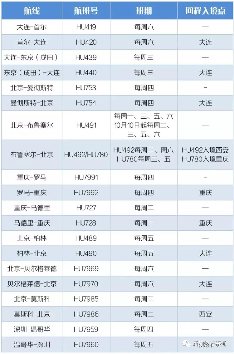 十月,海南航空新增两条国际航线:10月5日-大连=东京成田;10月8日:大连=首尔。11月6日起重庆-罗马航线将加密至每周2班。