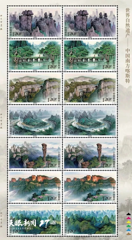 4月20日,记者从中国邮政集团有限公司获悉,国家邮政总局将于4月28日发行的《世界自然遗产——中国南方喀斯特》特种邮票(全套7枚),用精美的画面展示了石林喀斯特、荔波喀斯特、武隆喀斯特、桂林喀斯特、施秉喀斯特、金佛山喀斯特、环江喀斯特的独特魅力。7枚邮票中,贵州占其二,显示出世界自然遗产王国中“贵州地理”的重要存在。