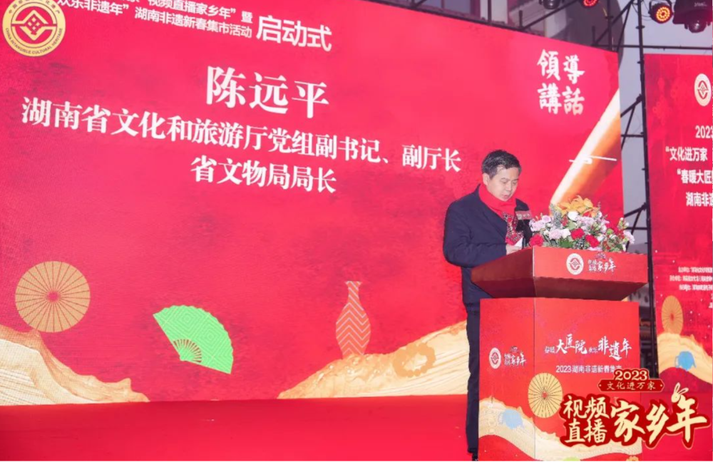 湖南省文化和旅游厅党组副书记、副厅长,省文物局局长陈远平发表讲话。他指出,本次活动在湖南全省遴选了一批具有代表性的非遗项目和产品,采用群众喜闻乐见的形式进行展示展演展销。推动非遗文化融入现代生活,为长沙增添了久违的年味。希望全省文旅人以此次活动为契机,坚定信心、迎难而上、埋头苦干、勇毅前行,为加快建设旅游强省和世界旅游目的地做出更大的贡献。