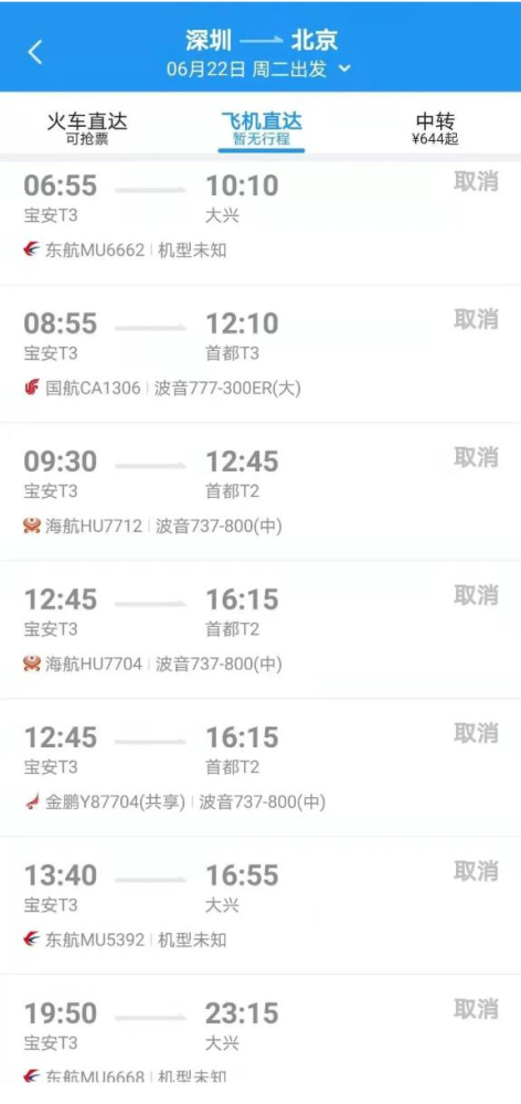 据飞常准APP航班查询结果,6月22日深圳往返北京的航班已经全部取消。6月23日及之后仍可查询到直飞航班,但是航班非常少。以6月23日为例,深圳至北京仅有CA1386及CA1314两班,且票价超过3000元。