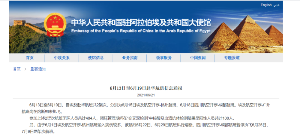 据中国驻埃及大使馆消息,6月13日至6月19日,自埃及赴华航班共2架次,分别为6月15日埃及航空开罗-杭州航班、6月18日四川航空开罗-成都航班。埃及航空开罗-广州航班尚在熔断期未执飞。