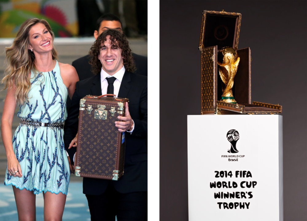 LV、足球、巴西——不知道你会不会和我一样想起 2014 巴西世界杯决赛现场,巴西超模 Gisele Bündchen 身穿 Louis Vuitton 2015 早春系列成衣,护送大力神奖杯惊喜亮相的一幕,当时安置大力神奖杯的是 LV 定制的奖杯箱。