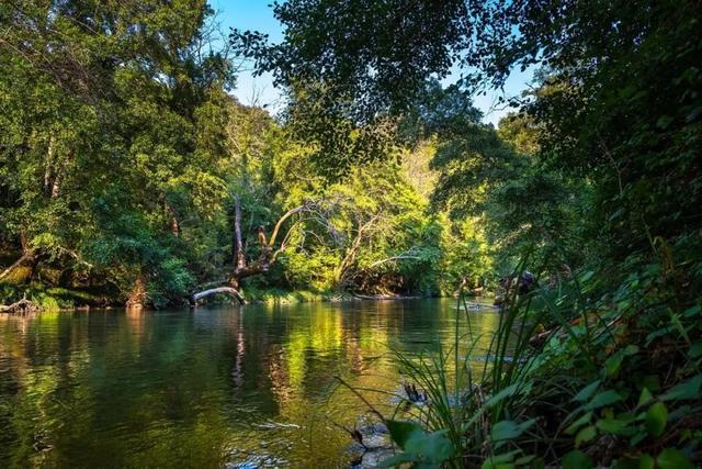 沿着山道缓缓穿行在狭窄蜿蜒,遮天蔽日的森林缝隙间,林木碧翠、环境静谧,水道蜿蜒,沉醉在远古甚至蛮荒的氛围里,有种仿佛时光倒流的沧桑美感。