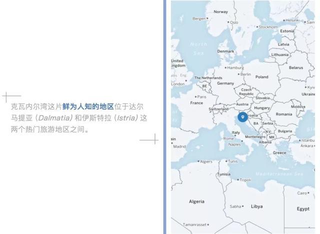 克瓦内尔湾是克罗地亚北部最接近山区的沿海地带,也是伊斯特拉半岛与克罗地亚内陆地区,不同地貌及人文特色的分水岭。高耸蜿蜒的山脉环绕,绵延不绝的原始海岸,点缀着远处的迷人海湾。