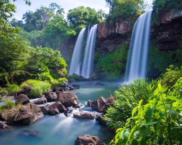 伊瓜苏国家公园森林、沼泽广布。世界七大自然奇观伊瓜苏瀑布呈弧形,共有275股大的瀑布。南翼的两组双层瀑布群在阿根廷境内,三大瀑布群连成一道垂挂于峭壁之上的天幕,水天一色、缤纷彩虹,极其壮观。