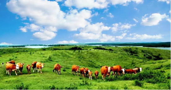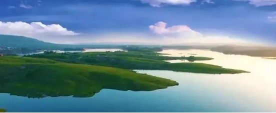 牧场与跃龙湖相邻,8286万立方米库容的水面及支流延伸于牧场腹内,草场傍着湖泊,湖水幽蓝,扁舟荡漾;湖泊依着草场,空气清润,面积辽阔,草色与湖水相映成景,鲜明别致。