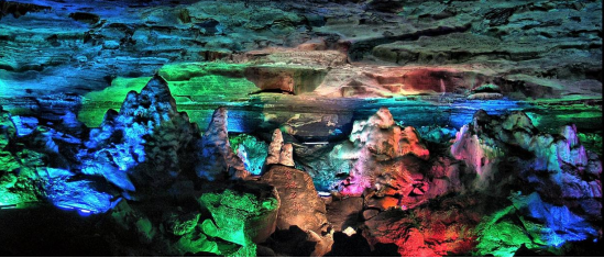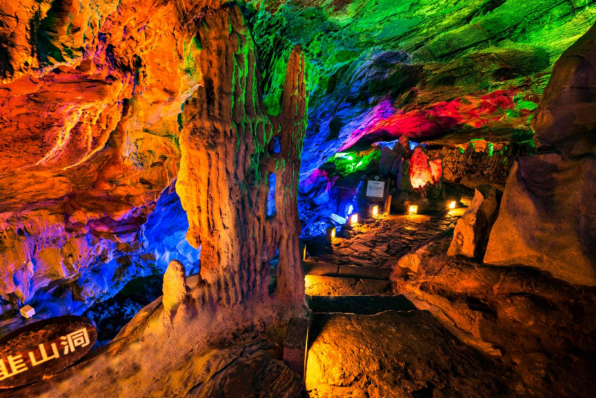 韭山洞内岩石千姿百态,一步一景,逆水泛舟,船行数十米后,渐有光亮,靠岸后,拾级而出洞口。
