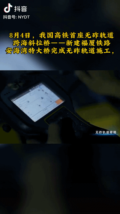 8月4日,中国高铁首座无砟轨道跨海斜拉桥——新建福厦高铁安海湾特大桥完成无砟轨道施工,中国铁建大桥局建设者成功攻克高铁跨海斜拉桥无砟轨道施工难题,取得高铁无砟轨道施工重大突破。安海湾特大桥是新建福厦高铁全线控制性工程之一。在中国高铁建设中首次在跨海斜拉桥中铺设无砟轨道,时速350公里高铁列车跨海过桥不减速,驶过650米主桥用时不到7秒。