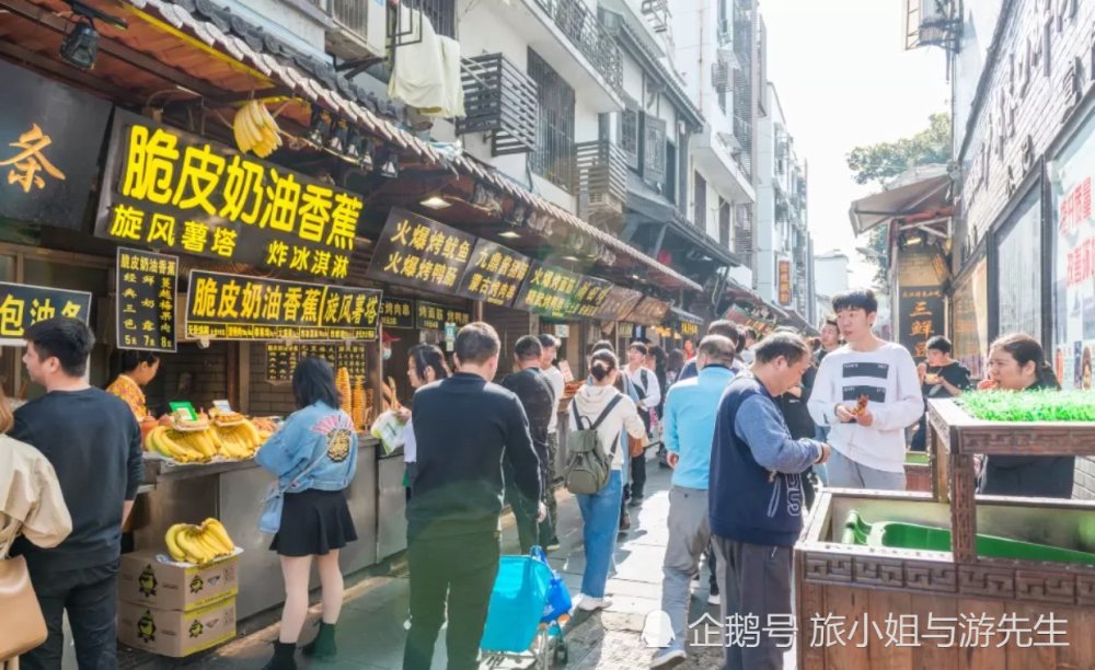 烤鸭肠的摊位门口竹签堆到半人高,各种烤猪蹄烤鱿鱼的烟气在空中袅袅升起,以绿色垃圾桶为圆心,端着各种一次性盘子碗的游客吃得热火朝天。不管是不是节假日,户部巷里面的人口密集程度都配得上那句:汉味早点第一巷。
