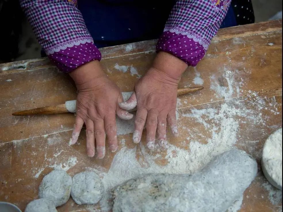 从面缸中挖几勺面粉,倒进面盆中,舀半瓢水倒进去,先用手将面粉搅拌成“面扑穗”,再用力揉成面团,将面团分成一个个鸡蛋大小的面剂子,揉拍成小小的圆面饼,洒上一点干面粉做面卜,用枣木做成的小擀杖,擀压面饼。