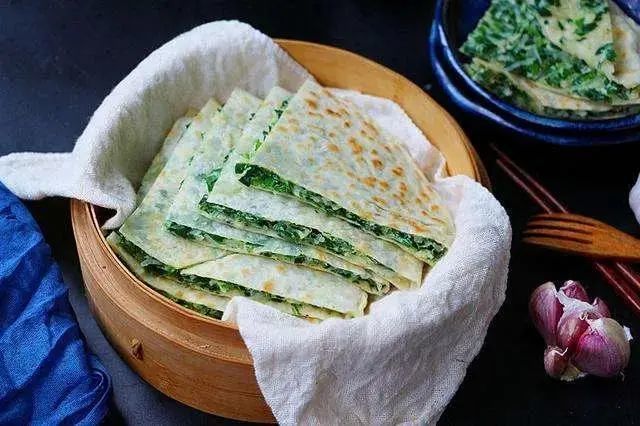 尤其是将芸香菜和韭菜掺在一起,再磕开一个鸡蛋搅碎拌进去,加盐、五香粉等做成馅料,摊平夹在两张死面薄饼中间,边沿用手按压紧实后,摊到抹过一层油的铁鏊子上,来回翻面直到烙熟。