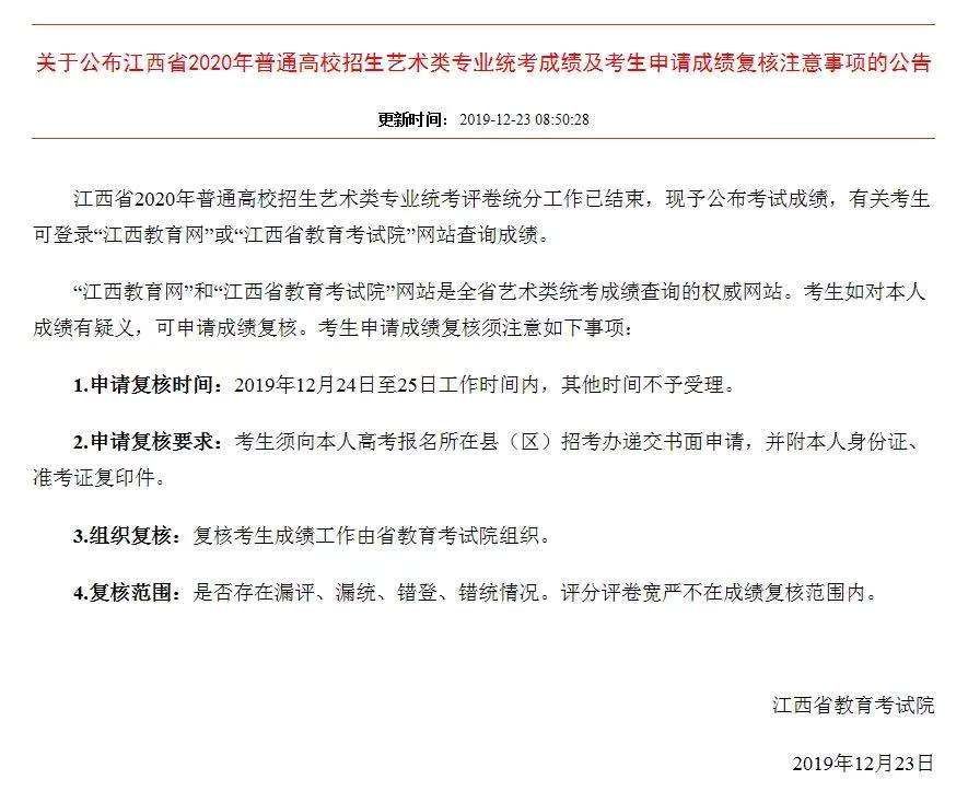 (2)江西省2020年普通高校招生艺术类专业校考安排在2020年1月中旬考试,今年12月27日—2020年1月3日网上报名。12月26日左右,江西省教育考试院将通过官方网站向社会公布《江西省2020年普通高校招生艺术类专业在赣设点校考高校、专业及考试时间安排表》。