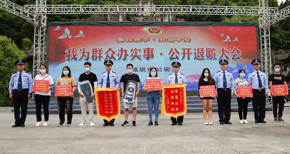 6月5日,福泉市公安局在文峰广场举行“警民携手·共筑平安,我为群众办实事·公开退赃大会”,依法将今年以来追回的总价值120余万元的被盗被骗物品及现金现场返还给受害群众。