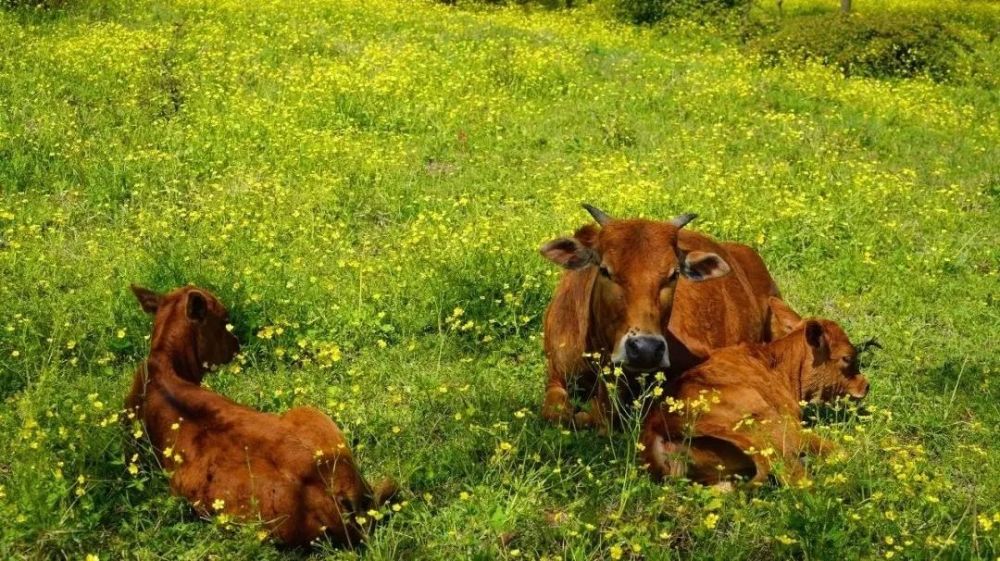草甸大约有几个足球场的大小,成群的黄牛在悠闲地吃草、休憩,不时发出一两声惬意的叫声,它们在温暖的阳光下享受着这一片天然草场。