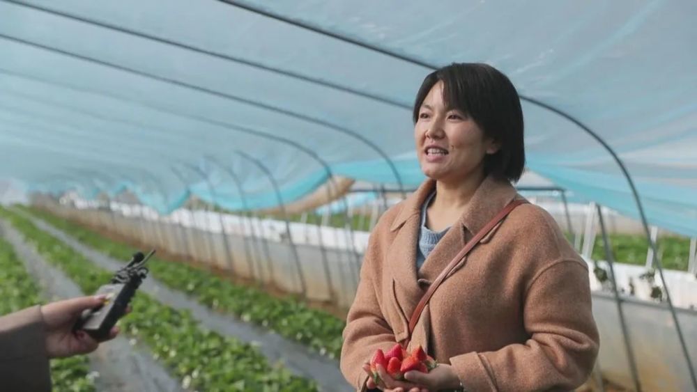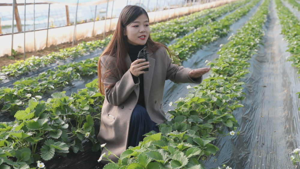 “我现在是在王家湾村的草莓种植园里,虽然现在正值初冬,但整个草莓大棚里却是一派绿意盎然的景象,大家也可以看到这里的每个草莓藤蔓上都开满了密密麻麻的花朵,也是格外的娇俏动人。”