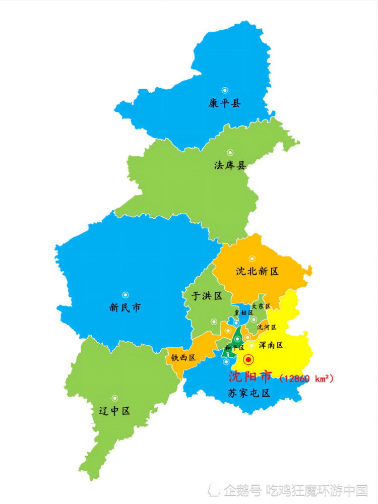 10个市辖区:和平区、沈河区、大东区、皇姑区、铁西区、苏家屯区、浑南区、沈北新区、于洪区、辽中区
