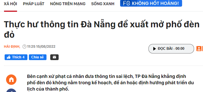 岘港市信息和通信部称,LDT账号的文章内容不真实,不仅误导了读者,还对岘港市的旅游发展规划产生了不好影响。警方调查和核实后,LDT账号的所有人也承认,上述发帖不规范、不正确、未经核实。