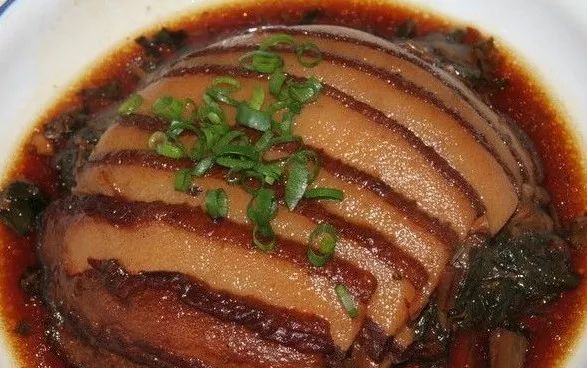 当地的特色小吃荤菜扣肉,是将五花猪肉的皮烧焦后刮洗干净煮熟,在晾干的过程中,不断往肉皮上涂酱油、醋、红糖、甜酒汁等,待佐料浸入肉皮后,再放到锅里煮。