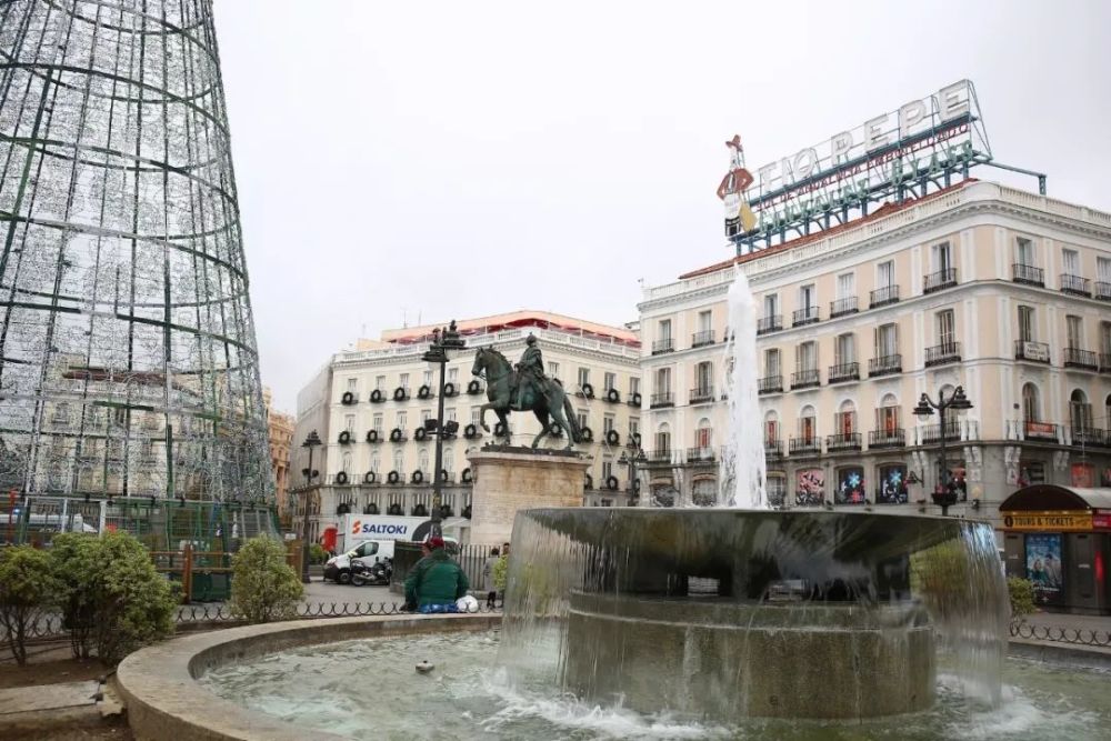 太阳门广场(Puerta del Sol)是马德里的中心,寄托着马德里人的深厚感情。广场呈半圆形,环绕四周的建筑之间有十条街道以广场为中心向外延伸,仿佛太阳散发出的光芒。广场中间是卡洛斯三世雕像,两眼喷泉则暗合了马德里作为“丰水之地”的由来。