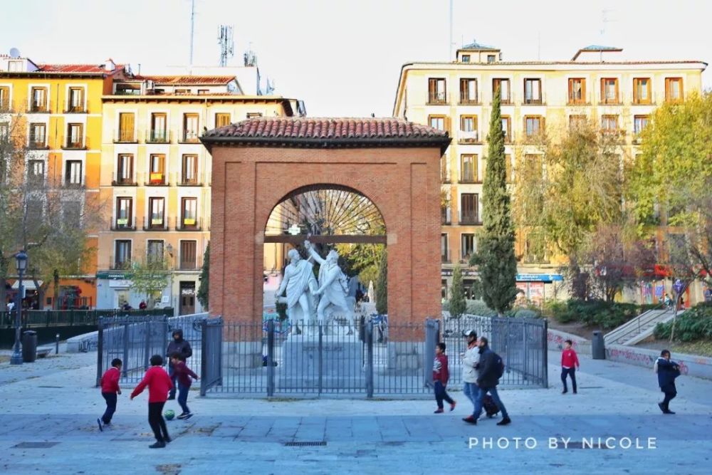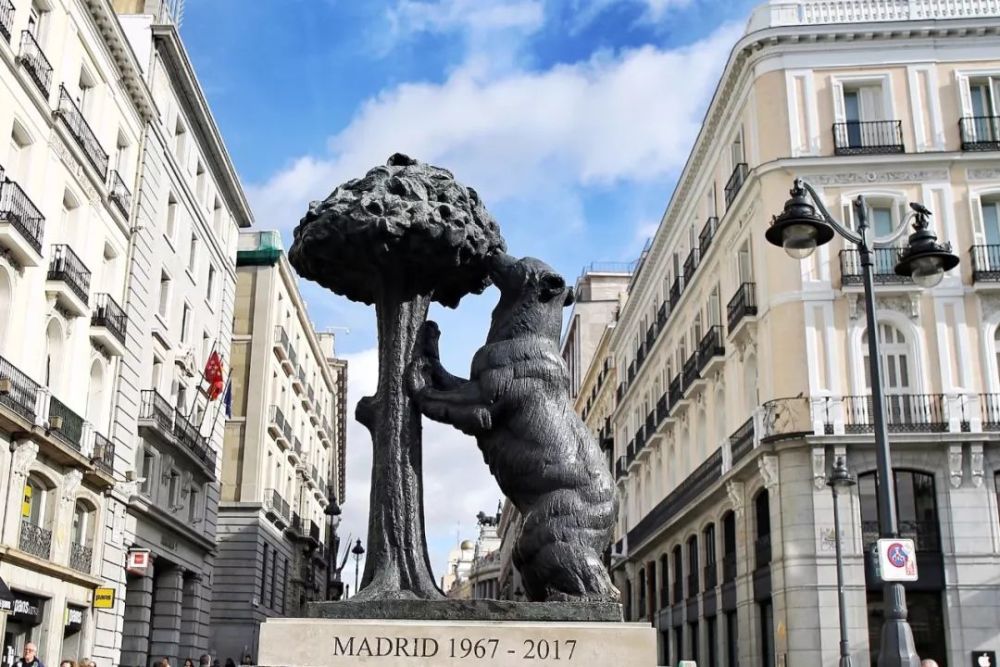广场东侧的棕熊抱莓树青铜雕塑是地标性建筑,它是马德里市徽的一部分,也是游客打卡点之一。