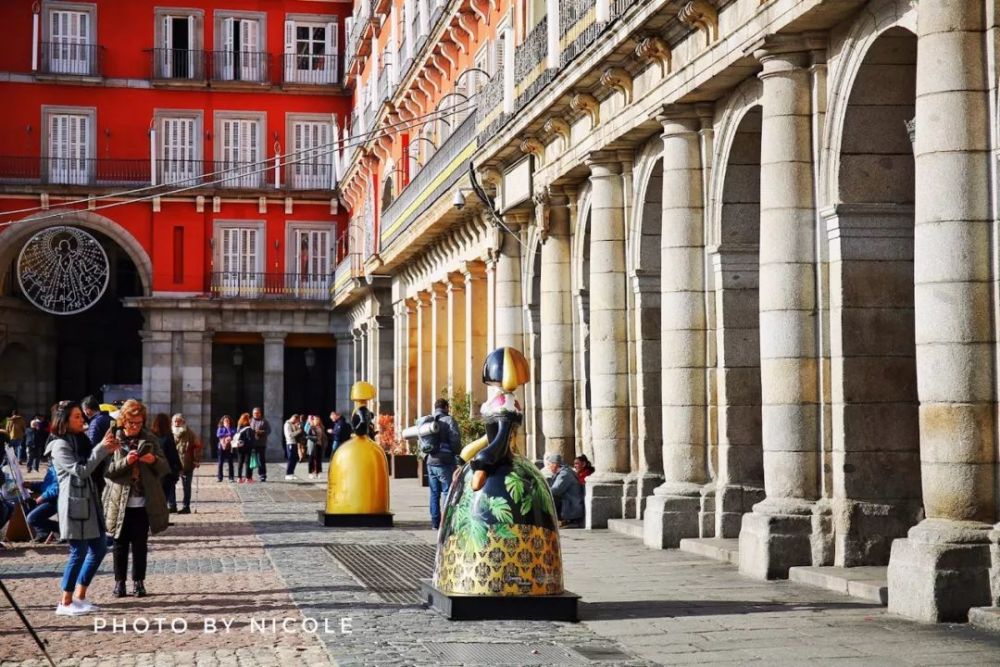 马德里的马约尔广场(Plaza Mayor)也叫市长广场,始建于16世纪,正是哈布斯堡王朝最辉煌的时代。最引人注目的就是位于广场正中的菲利佩三世国王的骑马雕像,最漂亮的是广场北侧那座最古老的面包房之家,外墙上布满各种壁画,是1989年马德里委托赢得竞赛的西班牙画家Carlos Franco设计绘制的。