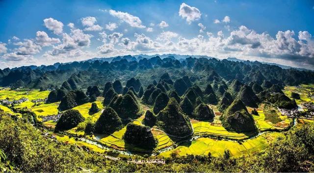 万峰林景区位于贵州省兴义市东南部,气势宏大壮阔,山峰形态奇特,整体造型秀美,是国内最大、最具典型性的喀斯特峰林。在三百六十多年前,明代著名旅行家徐霞客就曾到过万峰林,赞叹:“天下山峰何其多,惟有此处峰成林”。根据峰林的形态,分为列阵峰林、宝剑峰林、群龙峰林、罗汉峰林、叠帽峰林等五大类型。每一类都各具特色,既独立成趣,又与其他类型的峰林相辅相成,组成雄奇浩瀚的景观。万峰林旅游景区先后获得“国家重点风景名胜区”、“中国最美的五大峰林”等称号。