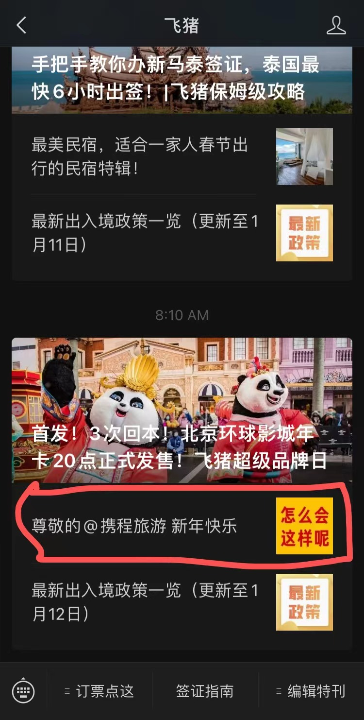 飞猪文章发布于1月12日8:10,文章开头表示:“一觉醒来,竟然被行业老大哥肯定了!”